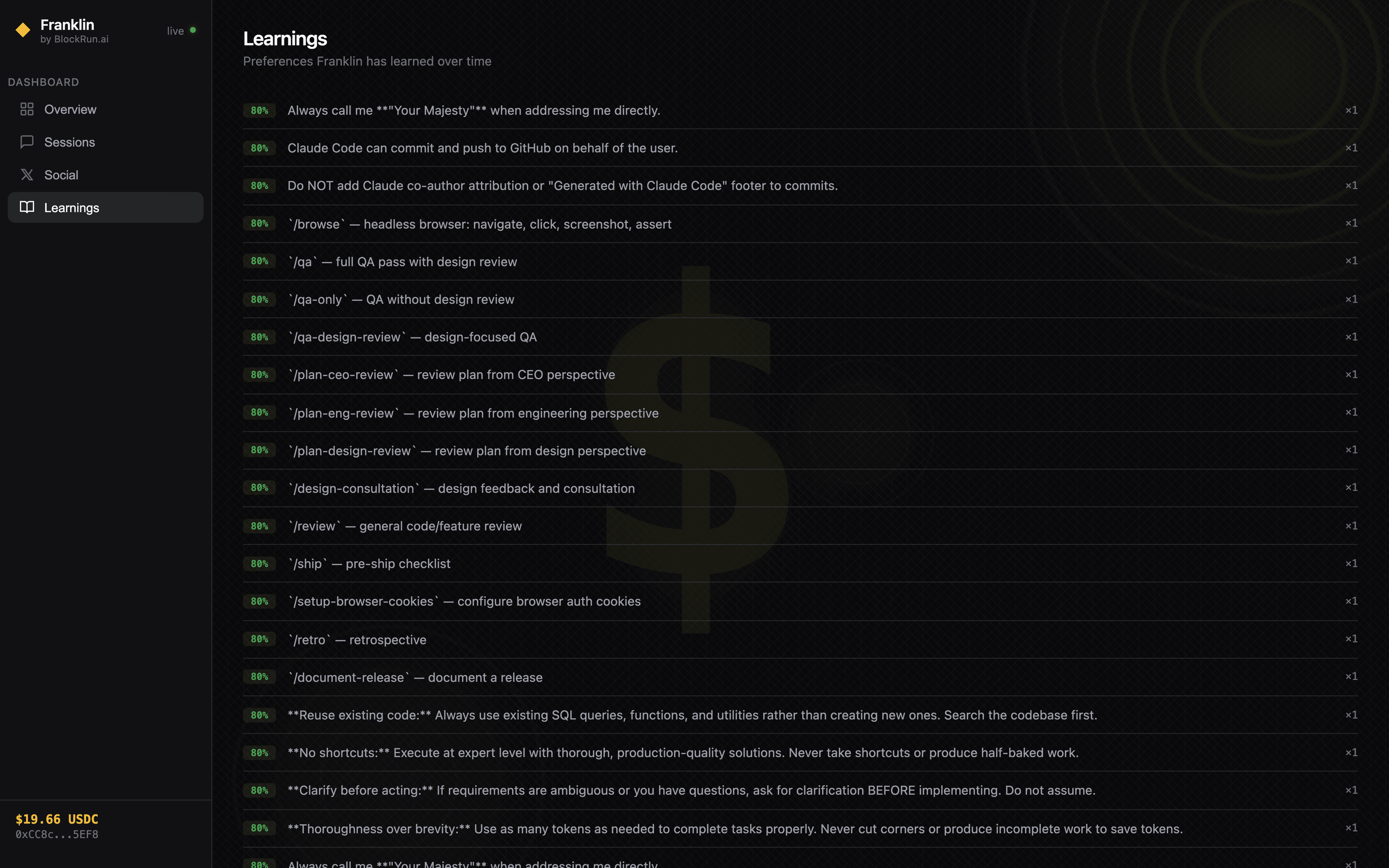 Franklin learns your preferences across sessions. Run /learnings to see what it knows. Coming from Claude Code? Run franklin migrate to import everything.