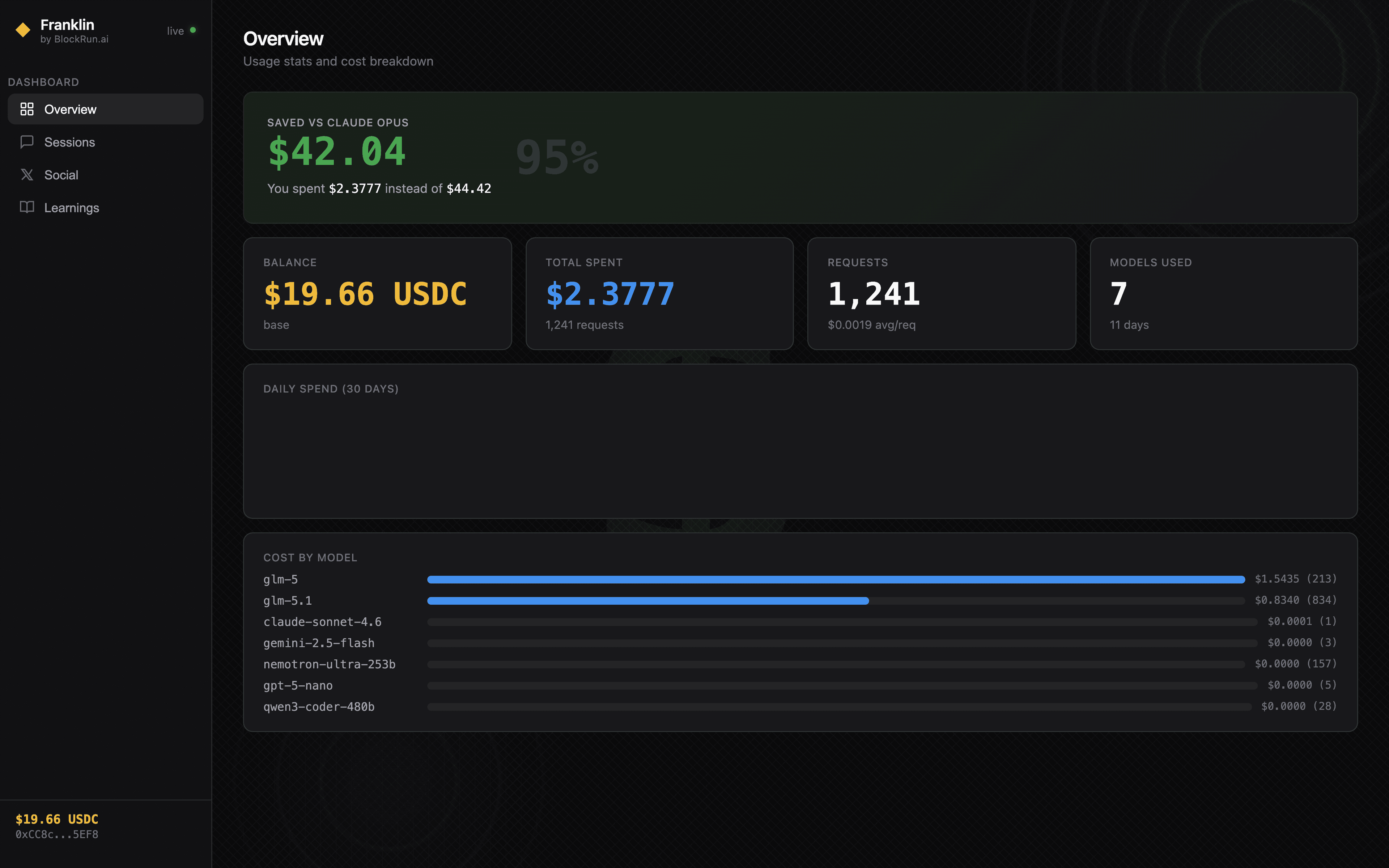 Real-time cost per call in the terminal. Daily trends, model breakdowns, savings vs Opus. Run `franklin panel` for a full localhost dashboard.